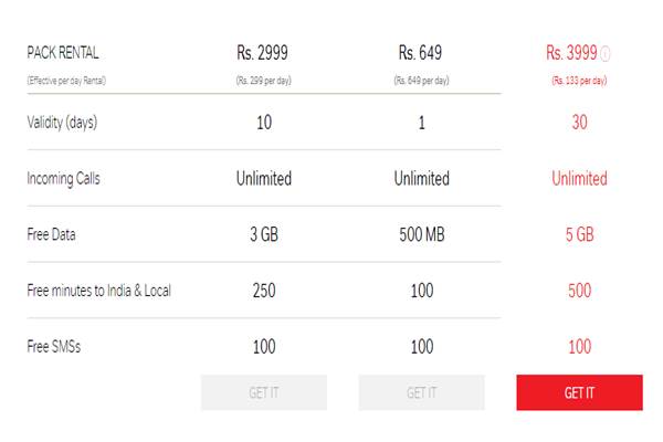 1) The cheapest plan will cost you Rs 499. The plan includes unlimited incoming calls, 500 MB free data, 100 minutes free calling to India, 100 free SMS. This pack will be valid for one day.