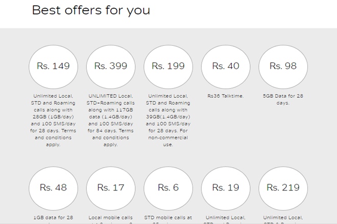 Rs 99 pack: The plan offers unlimited local and STD calls, roaming calls. The plan offers 100 sms per day and 1 GB data along with 30 GB data extra. The plan is valid for 28 days.
