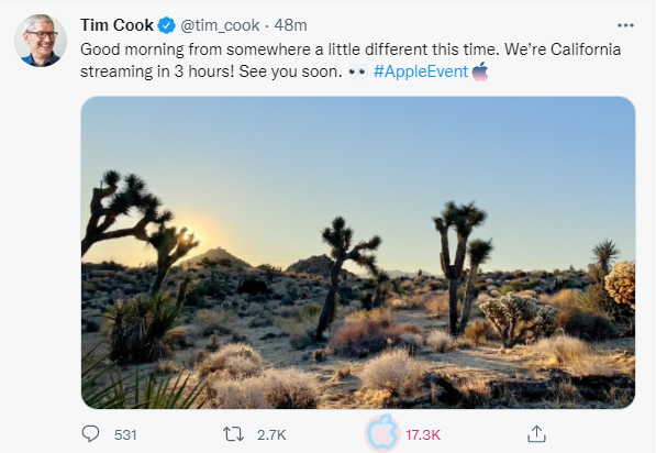 Apple CEO Tim Cook to take stage in a few hours from now as Cupertino gears for its first big fall event of the year where a host of products are set to be announced. Here’s Cook warming up for ‘California Streaming.’