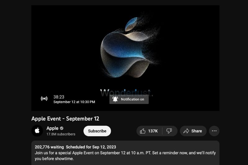 Apple iPhone 15 series announcement is merely 25 minutes away. Over 300k people are in the queue on YouTube, waiting for Apple's “Wonderlust” event to commence.