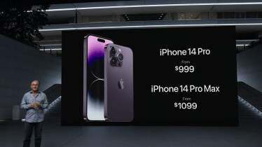 iPhone 14 Pro starts at $999 and iPhone 14 Pro Max at $1099, available from September 16.
