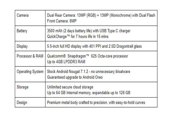 The Billion Capture+ comes with some top-notch features. It has a 13MP + 13MP dual rear camera, a long-lasting battery with Quick Charge™, powerful Snapdragon™ 625 octa-core processor for breezy multitasking, free unlimited cloud storage, and the latest Android Nougat. The phone has a premium metal body with easy-to-hold curves and a fingerprint sensor on the back for ease of use. The rear cameras are twinned with RGB and monochrome sensors that work like the human eye, and a dual tone flash to capture vibrant colours in vivid detail.