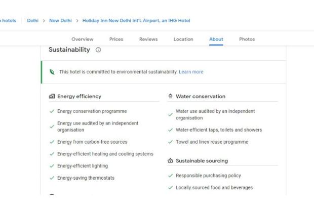 As can be seen in the screenshot, after searching for a hotel, when the user selects a hotel and scrolls down, they will be able to see a section ‘Sustainability”. Under the section, various sub sections like Energy efficiency, Water conservation, Waste reduction, Sustainable sourcing will be visible. All these sections will show the kind of policy the hotel believes in and what kind of measures the hotel takes.