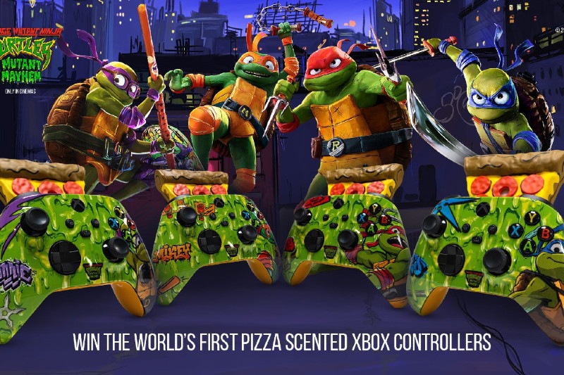 The controller, which is being given away as part of a sweepstakes to market Paramount’s upcoming Teenage Mutant Ninja Turtles: Mutant Mayhem movie. The controller has an inbuilt scent diffuser that releases the smell of pizza whenever the controller is turned on. The controller is designed to evoke the feeling of eating a fresh and cheesy slice of pizza.