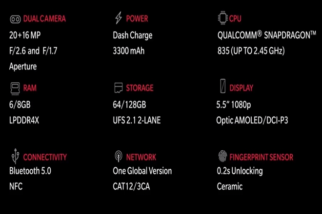 When it comes to specifications, the OnePlus 5 sports the fast Qualcomm Snapdragon 835 processor, clocked at up to 2.45GHz. OnePlus features a 5.5-inch full-HD Optic AMOLED screen (1920 x 1080 pixels). When it comes to the camera, OnePlus 5 is confirmed to have dual camera setup: the main 16-megapixel sensor has f/1.7 aperture and the 20-megapixel telephoto sensor has a f/1.6 aperture. In the front is a 16-megapixel sensor with f/2.0 aperture.