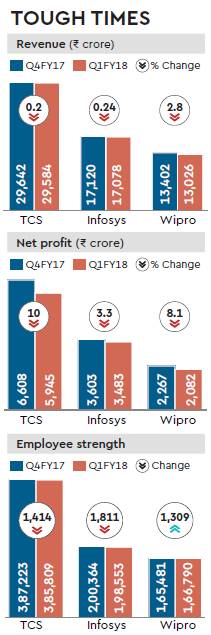 The latest financial performance of the big three of Indian IT industry—Tata Consultancy Services (TCS) , Infosys and Wipro—underscores the fact that the macro-economic challenges still persist with business momentum not picking up and net profits dropping. In short, the prospects of a double digit growth rate is still far away. The first quarter of FY18 for this top three companies has been consistent on one point —declining net profits. If TCS’s net profit dropped on a quarter-on-quarter (QoQ) basis by 10%, it was 3.3% for Infosys and 8% in the case of Wipro. The twin factors which affected their bottomline performance were wages hikes and the appreciating rupee against the US dollar. According to a note put out by HDFC Securities, TCS witnessed a wage hike impact of 150 basis points (bps) while the rupee appreciation was 80 bps for the first quarter. A similar trend was also noticed for Infosys and Wipro.