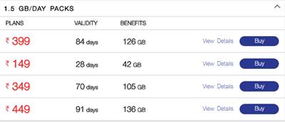 Rs 349 pack: This plan offers 3GB data per day for a time period of 28 days, which sums up to 84 GB data for the period of its validity.