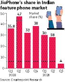 JioPhone’s share in the quarter under review plummeted to 4%. Since its launch in August 2017, it has sold around 70 million units.