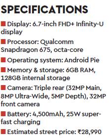 Shutterbugs will be pleased with the impressive 32MP triple rear camera capable of shooting stunning super slow-mo and ultra-wide videos. It has a 32MP low-light lens with f/1.7 that works well in any lighting condition. The 8MP ultra-wide lens has a 123-degree field of view, which enables users to capture both ultra-wide images and videos. The 5MP depth lens captures impressive portrait shots.
