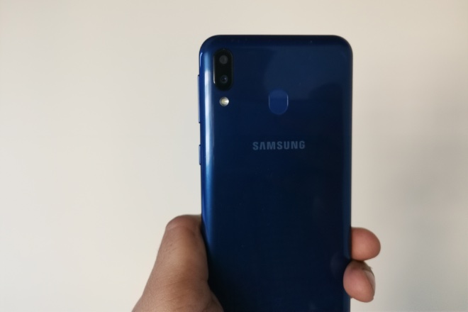 There is a dual camera island on the top left portion, an LED flash below it, and the fingerprint sensor towards the centre. On the right side, the phone houses the power/lock button and the volume rocker while the left side provides for the tray to insert two Nano-SIM cards and a microSD card simultaneously. The Galaxy M20 has a 3.5mm headphone jack, a speaker grille, a microphone, and a USB Type-C port at the bottom. The top just has a secondary mic for noise-cancellation. The smartphone weighs 186 grams, which we could feel when holding it for long.