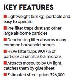 It is not a hard task to set up the Sharp air purifier. With pedestal mode of installation, it is extremely convenient to use and install the machine. Connect the machine to a power source and the air purifier comes to life in an instant. What impressed me most was the machine’s extremely silent operation. The power button is at the top along with a button to select the speed. The display panel has various other command buttons—Mode, Power, Mosquito Catcher etc. The Dust sign indicates the air purity of the room in three levels with colour changes—Green is clean, Red is impure and Orange is in-between. The Sharp air purifier has inbuilt intelligent light sensors which constantly monitor the air quality in the room to adjust clean air flow in accordance to the air quality.
