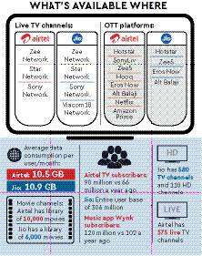 Though Bharti has been good at catching up, Jio is still far ahead in terms of cinema and TV subscribers with its Jio cinema and TV together having a user base of around 150 million.