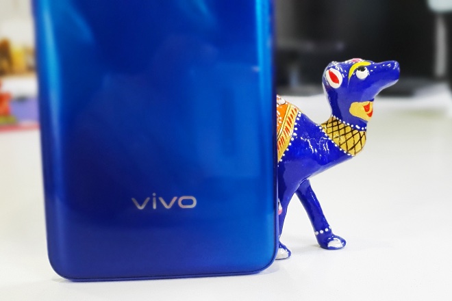 At the bottom is the Vivo branding but the top has a protruding camera island that houses three shooters along with an LED flash. The camera mount is protected by a glass cover that throws 180-degree reflections as well. We like how the device feels premium in hands. We got the Topaz Blue colour model but there is another Red Ruby variant you can buy.