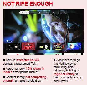 Dinkar Ayilavarapu, partner, Bain & Company, believes with Indians not really short of options on video OTT, “any other late entrant would probably struggle”. However, Ayilavarapu points out that Apple’s strength lies in its loyal customer base, which will allow the tech firm to tailor its offering to subscribers better. Apple may not go mass, but explore other avenues for content like producing global content (given a very large base in the world) and leveraging that in India or accessing third-party content. “It won’t be easy but will be interesting to see how it goes,” added Ayilavarapu.