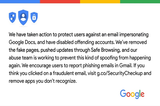 Google has said, “We have taken action to protect users against an email impersonating Google Docs, and have disabled offending accounts.” It added: “We’ve removed the fake pages, pushed updates through Safe Browsing, and our abuse team is working to prevent this kind of spoofing from happening again. We encourage users to report phishing emails in Gmail.”
