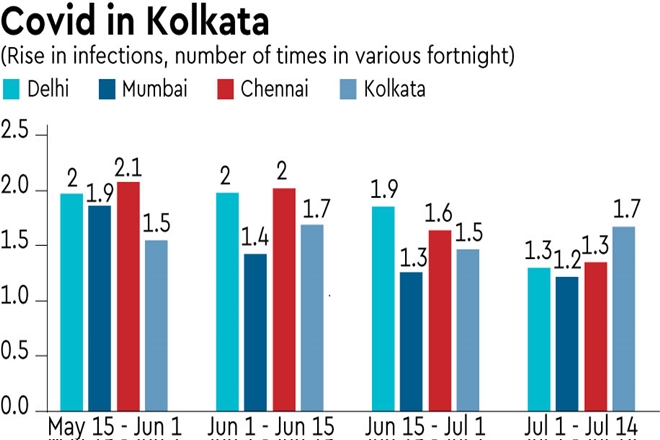 Infection levels in Kolkata have nearly doubled in just the last fortnight, making it one of the few big cities in the country with this dubious distinction. The number of Covid-19 infected persons in Kolkata rose from 5,984 a fortnight ago to 10,026 on Tuesday. Among cities that have a somewhat similar population, only Bengaluru saw an almost four-fold jump from 5,290 to 19,702 cases while Delhi’s cases from 87,360 to 113,740, Mumbai from 77,197 to 93,984 and Chennai from 58,327 to 78,573.