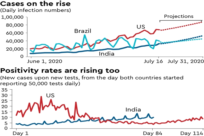 The fact is infections in India are growing at a faster pace; on Thursday, infections rose at 3.4%, nearly twice that of Brazil’s 1.8% and considerably higher than the US’s 1.9%. If the momentum sustains, India will soon be reporting nearly 52,000 infections a day and will hit close to 1.5 million cases by July 31; by then Brazil will be adding 45,000 infections a day.