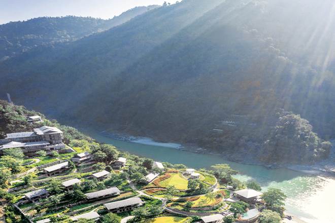 But the need of the hour is for big names in tourism and hospitality to wake up to ecotourism. So it is heartening to come across places like the Taj Resort in Rishikesh that are in sync with nature. Located about 35 kilometres upriver from the bustle of Rishikesh, the first thing that strikes you about the place is the simple architecture, which blends right in with the landscape. The stone and wood facade with slate floors and roofing is how locals construct their houses in the region. Known as kathkuni architecture, the style is a staple in the hilly states of Himachal Pradesh and Uttarakhand. The interiors of the resort replicate the ode to nature, with wood and stone walls and muted earth-toned décor, reflecting the colours of the river stones and surrounding flora.