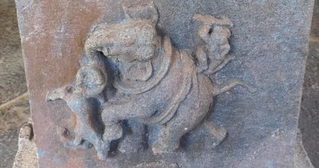 As the name suggests, the Mahadev Mandir is dedicated to Lord Shiva and resembles the famous temples of Aihole in Karnataka. It has a linga, a statue of the Nandi (bull, Shiva’s vehicle) whose head has been vandalised, statue of a cobra, and that of an elephant trampling a horse.