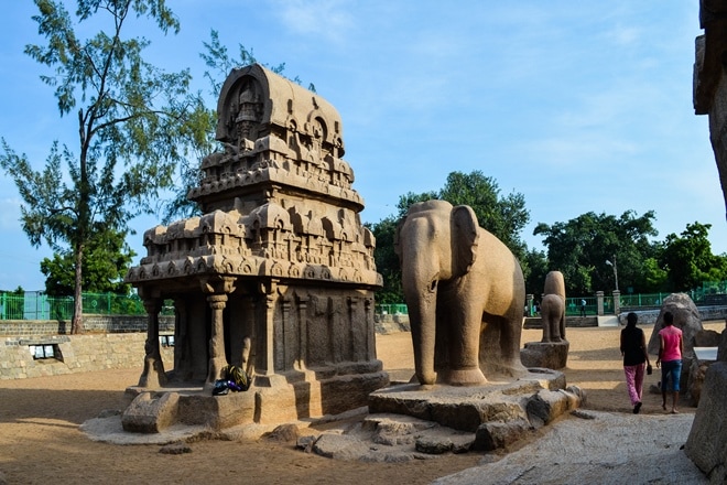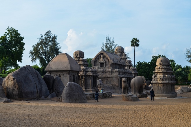 Among the forty heritage sites in Mahabalipuram, the Pancha Rathas hold a rather unique position. Built under the patronage of Narasimhavarman I (630-668 CE), these rathas are a group of five monolithic free-standing temples that were cut out from solid granite and diorite rocks. The five temples are symbolically named after the Pandavas and Draupadi but do not have any connections with the Mahabharata.