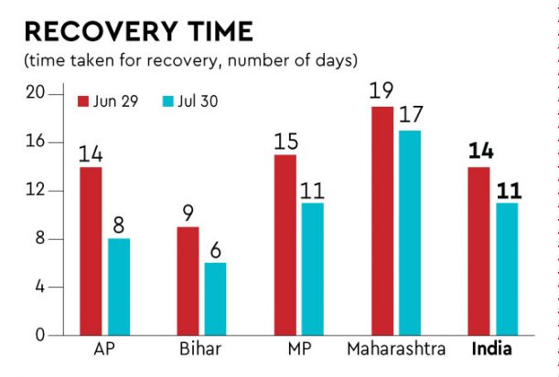 Interestingly, recovery rates differ a lot between states for no apparent reason. While it takes 17 days for persons to recover in Maharashtra, it takes just 11 in Madhya Pradesh. In Bihar, it took nine days for a person to recover a month ago, but it now takes just six days. Around a third of Indian states and UTs had a recovery time of fewer than 10 days. In the case of Andhra Pradesh, the recovery time was 14 days on June 29, and this has fallen to just eight days now.