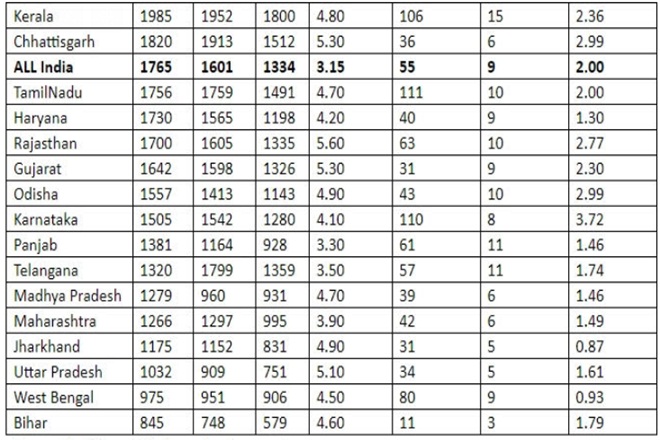 Table source: Ravi Duggal, independent researcher with data sourced from RBI State Finances Report 2019-20; the National Health Profile 2019, MoHFW, Govt of India, 2019; Registrar General India’ s Population Projections.