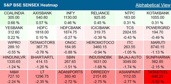 Shares of heavyweight companies such as L&T, Tata Steel, ITC, M&M, SBI, Asian Paints, IndusInd Bank, Sun Pharma, Maruti Suzuki, Hindustan Unilever and HDFC Bank contributed heavily to the Sensex losses. Collectively these 11 stocks alone wiped off about 204 points out of the 236-point drop in the index. The benchmark S&P BSE Sensex shed as much as 437 points to a day’s low of 33,573.52 before settling down 236.1 or 0.69% at 33.774.66. A market-wide mini-correction was observed in the Indian equities in the afternoon trades when shares of SBI plunged nearly 6%.