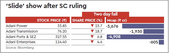 Shares of companies of the Adani Group continued to fall on Wednesday after the Supreme Court’s verdict on Tuesday that Adani Power and Tata Power were not entitled to compensatory tariff for the higher price of imported coal. The companies can, however, be compensated for any change in Indian law, the apex court said, asking the power regulator to look into the matter.