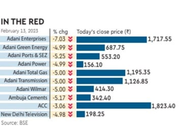 Adani Enterprises slumped 7%, while Adani Ports shed 5.25%. Five group firms — Adani Total, Adani Transmission, and Adani Wilmar, Adani Green, and Adani Power — were locked in their lower circuit of 5% on Monday.