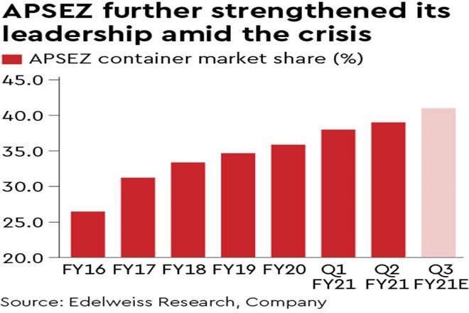 With economic recovery gathering steam, we expect the demand momentum to sustain. Moreover, APSEZ continues to hike tariff in the marine business (seasonal hike in January) as well as contracted customers (70% volumes; hike in March), in line with WPI inflation of ~3%. Thus, we believe, Covid-19 has further entrenched APSEZ’s dominance, which will enable this growth juggernaut to continue to roll.