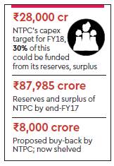During the recent discussions with the department of investment and public asset management (DIPAM), NTPC had sought exemption from buyback, saying its massive capex plan needs to be partly funded from its reserves. NTPC plans to fund about 30% (Rs 8,400 crore) of planned capex in FY18 from its reserves and surplus, which stood at Rs 87,985 crore on March 31, 2017.