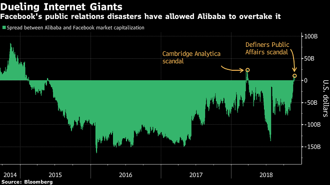 It is the second time this year Alibaba has topped its U.S. rival, the first coming in March following revelations surrounding Cambridge Analytica, the consulting firm that obtained data on Facebook users without their consent.