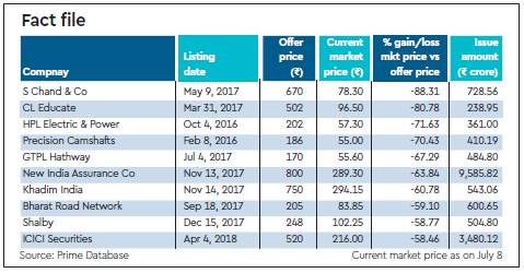 S Chand and Co, CL Educate, HPL Electric and Power, Precision Cramshafts, GTPL Hathway and New India Assurance lead the list of wealth destroyers, losing up to 88.3% since their listing. FE had earlier reported that the stock markets have given education sector a thumbs down. “There is quite often a frenzied approach to IPO promotion by those who promote such issues. This approach itself drives quite a large number of investors to book profits and exit once they see some premium. Their intention was never to stay invested. Thus, by itself pulls down the stock prices,”said K Joseph Thomas, head of research at Emkay Wealth Management.