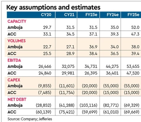 Raise Estimates/PT: We align FY23 to new financial year format, raise FY24/FY25 Ebitda estimates for both Ambuja/ACC — factoring in higher volume growth and Ebitda/T assumptions (group related savings to the tune of Rs 300/T). Given the faster growth trajectory for Ambuja under new leadership, we now value Ambuja’s consolidated Ebitda at 16x EV/Ebitda, one notch higher than 15x target multiple for Ultratech.
