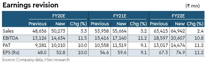 Agri segment, inventory restocking and new OTR line to boost growth: Our monthly export data tracker suggests pick-up in exports from India to developed markets. BIL too benefits from the improving demand traction seen across its key markets. We believe CY20 could mark the resumption of restocking as stock levels remain very low. Mathematically, restocking for even a couple of weeks could add 4-5% to BIL’s growth while the new 5k-MT OTR line is also expected to support growth in FY22. Overall, we assume a CAGR of ~8% over FY20e-FY22e.