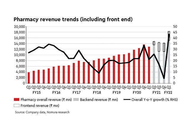 COVID-19 patients accounted for ~24-26% of healthcare services revenues. COVID-19 vaccinations accounted for Rs 1.9 bn of overall company revenues. AHLL also benefited from vaccination and reported its highest-ever Ebitda and Ebitda margins. Pharmacy back-end Ebitda margins (ex-Apollo 24/7 operating costs) improved 38bp q-o-q owing to strong top-line growth and an increase in private-label sales.