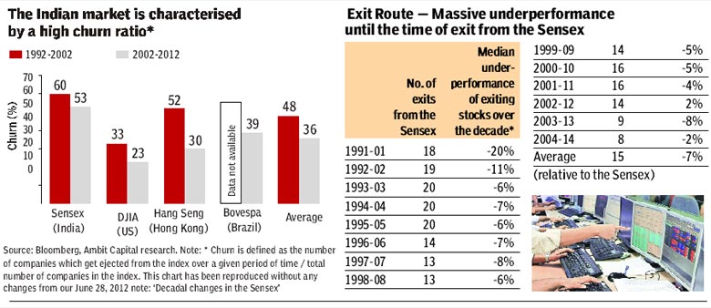 Ambit’s analysis showed that Sensex churn across 10 years peaked at 67% (or 20 replacements in a 30-stock index) in the years following the 1991 reforms (1993-1995). From those levels, Sensex churn has fallen to a low of 27% (eight replacements) in the latest 10-year iteration (from 2004 to 2014).