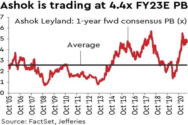 AL’s Q4 EBITDA rose 110% q-o-q, 18% above JEFe. The second wave of Covid has impacted truck demand and delayed the up-cycle; however economy is recovering well and June e-way bills rose 2% vs 2019. We cut FY22e EPS by 57% but broadly maintain FY23 estimates. We retain Buy but also our view that investors should moderate return expectations after ~3x rally since Apr-2020 as stock is already at 4.4x FY23e PB vs last peak of 5.8x while AL’s market share is slipping.