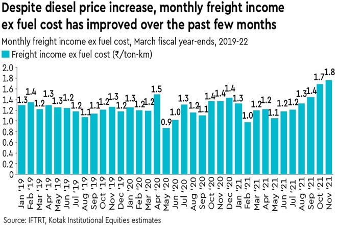 Improving profitability of fleet operators to support recovery in truck demand: We expect recovery in truck demand led by (i) a sustained recovery in economic activity (especially tipper segment) on account of better freight demand and (ii) higher freight income resulting in improvement of fleet operators’ profitability. Freight income (adjusted for diesel price) continues to improve led by better capacity utilisation over the popular routes despite sharp increase in diesel prices. Fleet utilisation level has improved to 75-77% currently and we believe once the utilisation level reaches 80% (on a sustainable basis), fleet operators will have to opt for fleet expansion or replacement of older fleets, which should lead to higher demand in upcoming quarters. Lack of financing availability for small fleet operators and disruption in economic recovery due to the Omicron variant remain a key risk for CV cycle recovery.