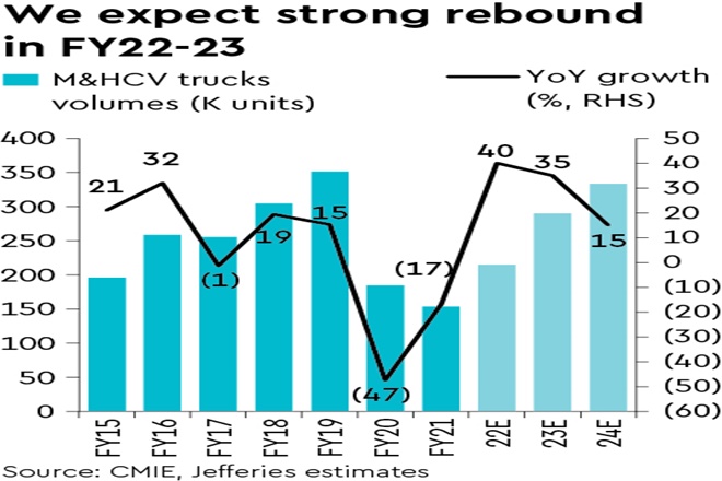 Trucks rising: Trucks entered a downturn in Nov-2018 and wholesales fell 56% over FY19-21. Indian economy is recovering well and Jul-Oct e-way bills, measure of road freight movement, were 23-39% above 2019. Truck retails in Sep-Oct were also 1-5% higher than 2019. We expect a big demand rebound ahead with volumes rising 40%/35%/15% y-o-y in FY22/ FY23/FY24; our FY24 volume is still 5% below FY19 peak.