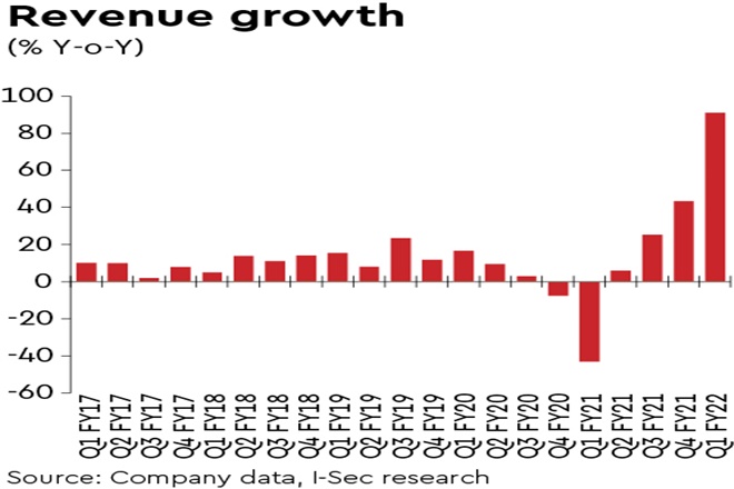 Q1FY22 results: APNT reported consolidated revenue, Ebitda, PAT growth of 91.1%, 88.7%, 159.2% y-o-y, respectively. Standalone revenue, Ebitda, PAT growth was 95.6%, 88.9%, 136.6% y-o-y, respectively. Domestic decorative volume growth was 106%. International business as well as Industrial paints also reported strong growth. Due to 13-15% higher input prices, gross margin declined 678bps but Ebitda margin fell just 20bps due to cost saving initiatives. With 104% higher other income, adjusted PAT was up 159.2% y-o-y.