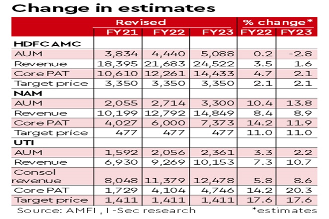 This has resulted in a strong possibility of earnings upgrades in FY22. Factoring in the 5MFY22-TD performance, relative cost structures and RoE, we upgrade FY22/23 earnings estimates for Nippon Asset Management (NAM) by 14%/ 12%, UTI Asset Management (UTI AMC) by 14% / 20% and HDFC asset management company (HDFC AMC) by 4.7%/ 2%. We maintain BUY on UTI AMC and ADD on NAM while we downgrade HDFC AMC from Add to HOLD.