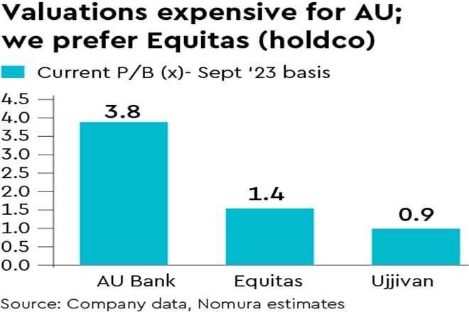 We have highlighted recently some divergences in the asset quality trends which we find difficult to comprehend. While we remain positive on the long-term story of AU with strong growth trajectory, universal bank optionality and healthy book compounding, we find less comfort in the near-term outlook, especially with valuations at 24x/3.8x Sep-23F EPS/book providing less room for any disappointment; hence, we maintain our Neutral rating. We prefer Equitas (holdco; EQUITAS IN, Buy) over AU within the small finance banks (SFB) space.