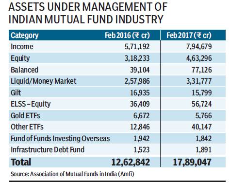 Asset under management (AUM) of Indian mutual fund industry continued to surge largely due to sharp inflows into income and equity schemes. According to the data from the Association of Mutual Funds in India (Amfi), AUM of Indian mutual fund industry stood at R17.89 lakh crore as on February 2017, compared to R12.62 lakh crore in the corresponding period of the previous year, registering a growth of 41.67%.