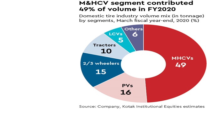 With economic activity picking up, we expect the OEM segment to grow by 6.2% CAGR and the replacement segment to grow by 5.5% over FY2020-25e. As per our channel checks, replacement segment demand continues to remain strong, especially in the farm equipment and M&HCV segments, and with OEM segment demand recovering, we expect tyre industry growth prospects to remain strong in the near term.