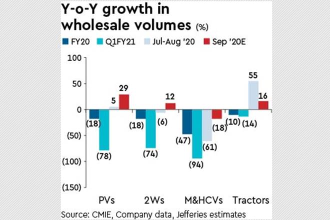 Indian auto industry witnessed strong pick-up in wholesale volumes in September led by gradually improving retail demand and inventory build-up ahead of the upcoming festive season. Based on OEM volumes, we estimate PVs grew 28-30% y-o-y, 2Ws rose 11-13%, tractors were up 15-17% while M&HCVs declined just 16-20% y-o-y. The sharp recovery in wholesales in recent months has also set the stage for a turnaround in performance for auto companies in Q2.
