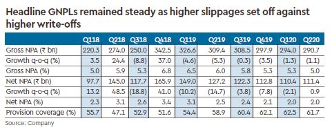 Axis Bank reported an ‘apparent’ Q2FY20 loss of Rs 1.1 bn, primarily due to the DTA markdown. That said, the quarter marks a strong core operating performance (with PPoP growth of 25%-plus y-o-y). Key highlights: (i) Slippages were elevated (at 3.9%), but not a negative surprise as 97% of corporate slippages stem from the watch list. Besides, limited downgrades to BB and below book lend comfort; (ii) sustained loan growth (>14% y-o-y) compared with moderation for peers, a better NIM (up 10bps q-o-q) and strong operating leverage (opex up merely 6% y-o-y) lifted core profitability.