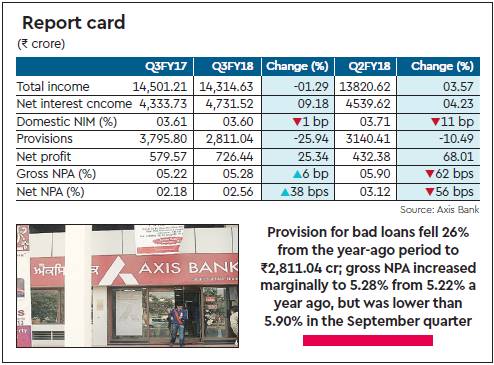 Axis Bank on Monday reported a 25% year-on-year increase in its third quarter net profit to Rs 726 crore, helped by strong loan growth in both retail and corporate segments and a lower provision for bad loans. The Mumbai-based private sector lender said its net interest income, or the difference between interest earned and interest expended, grew 9.2% from a year ago to Rs 4,731.52 crore in the December quarter. In the previous quarter, it stood at Rs 4,539.62 crore. “There are clear signs that growth has started picking up. Our loan growth during the quarter was quite strong at 21%, and that growth was across all segments. The retail segment grew 29% year-on-year. In SME, we saw a growth of 27% and corporate credit grew 12%,” said Jairam Sridharan, chief financial officer, Axis Bank. “Demonetisation was announced in the third quarter of the previous fiscal. Hence, there is a strong base effect on most of these metrics. But despite that, it is quite clear that growth is starting to come back. While we might see some moderation in the fourth quarter, because the base effect will change, the overall strength of the market is visible in terms of loan demand growth,” he added.