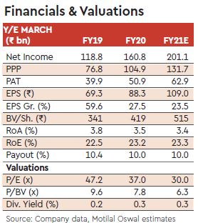 BAF has maintained its robust growth trajectory, with deepening geographical penetration and increasing repeat business. Over the past two years, it has also enhanced its capabilities on two fronts— generating higher fee income and improving the deposit franchise. We expect the improving deposit franchise to be a key driver for incremental liabilities over the next few years. Given its parentage and AAA-credit rating, BAF has comfortably sailed through the recent liquidity crisis and maintained strong growth rates. However, the recent asset quality concerns in certain products might cause some slowdown in loan growth. We expect AUM growth of 30% y-o-y for FY20 v/s 38% CAGR over past three years. We largely maintain our estimates. Neutral with a TP of Rs 3,550 (7x FY21e BVPS).