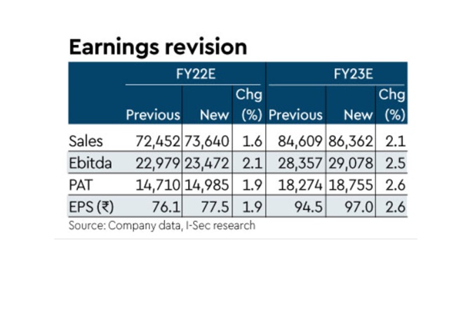 Downgrade to ADD: We expect healthy FCF generation of ~Rs 24 bn over FY22e/ FY23e. Considering the current momentum, we raise our earnings estimates by 2%/2.6% for FY22e/FY23e, respectively. We also raise our target multiple to 25x (earlier: 24x) based on strong growth and top-quartile return metrics. Post a >40% rally YTD-CY21, the stock factors in many of the positives and potentially limits near-term upsides. Downgrade to Add (from Buy) with a revised TP of Rs 2,425 (earlier: Rs 2,269).